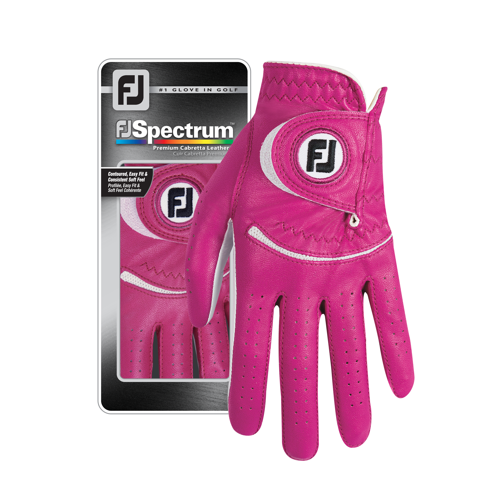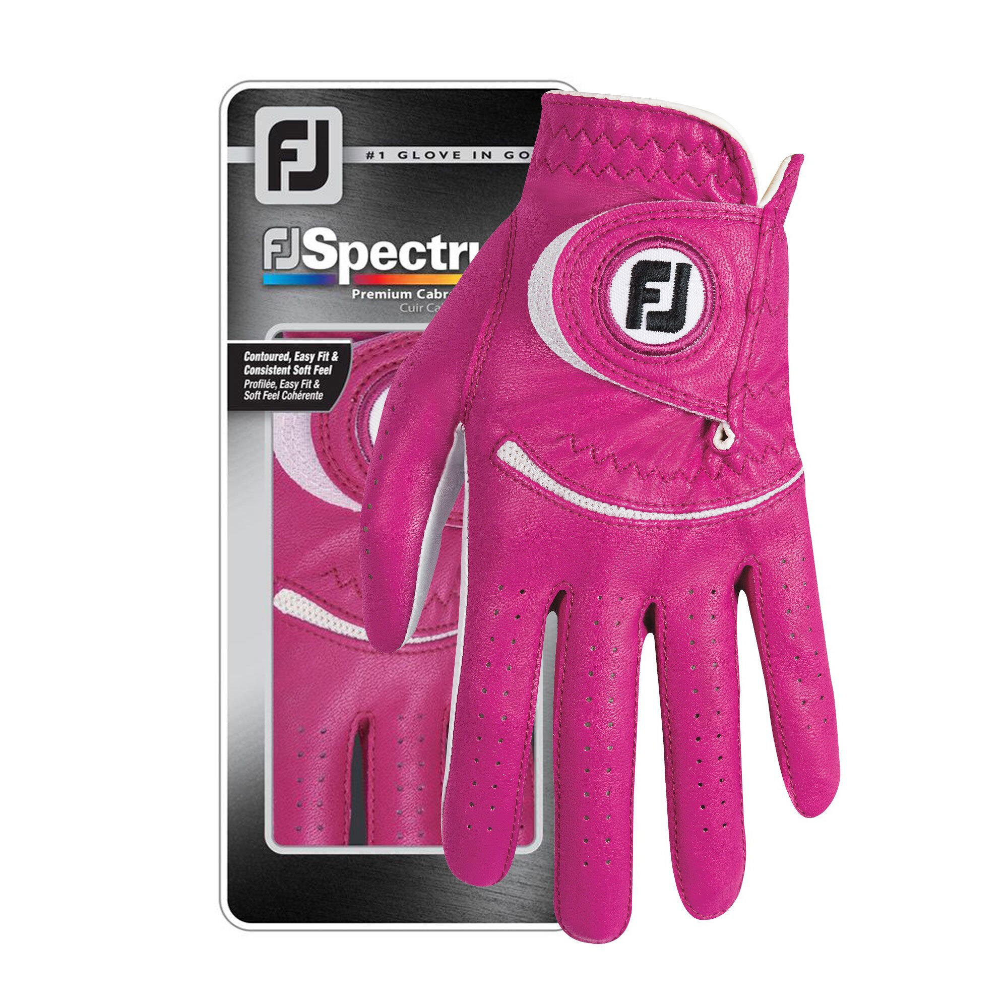 Leder trifft Farbe - FJ Spectrum für Damen! Weiches, speziell gegerbtes, wasser- und schweißresistentes Cabretta-Leder in der Handfläche und FootJoys Hochleistungsmaterial FiberSof in vielen modischen Farben im Handrücken kombinieren das Beste aus beiden Welten.